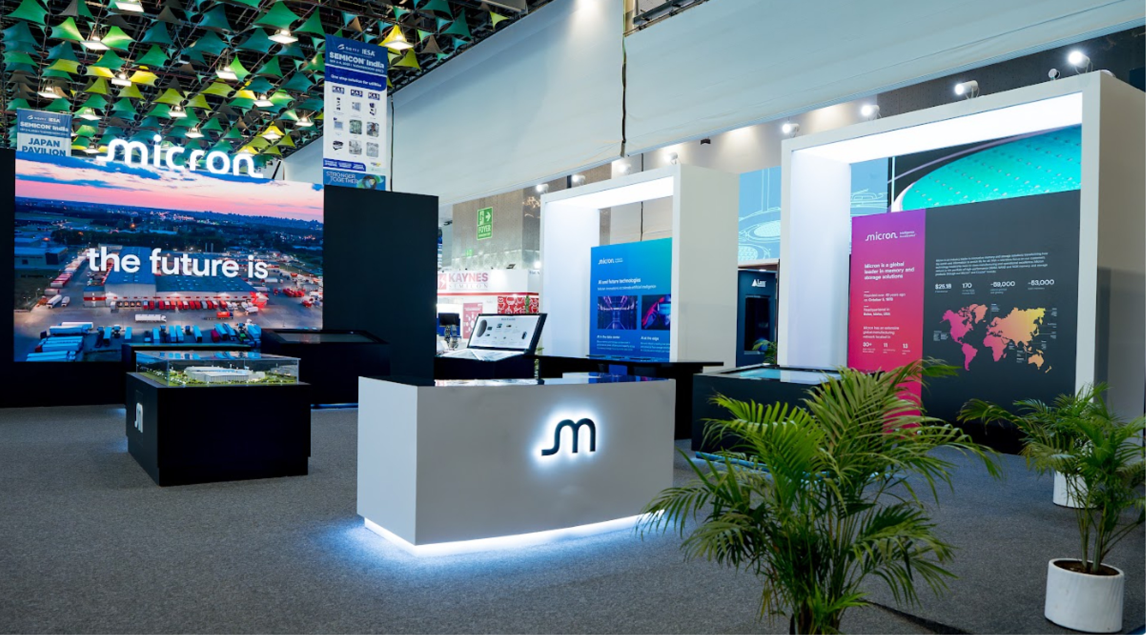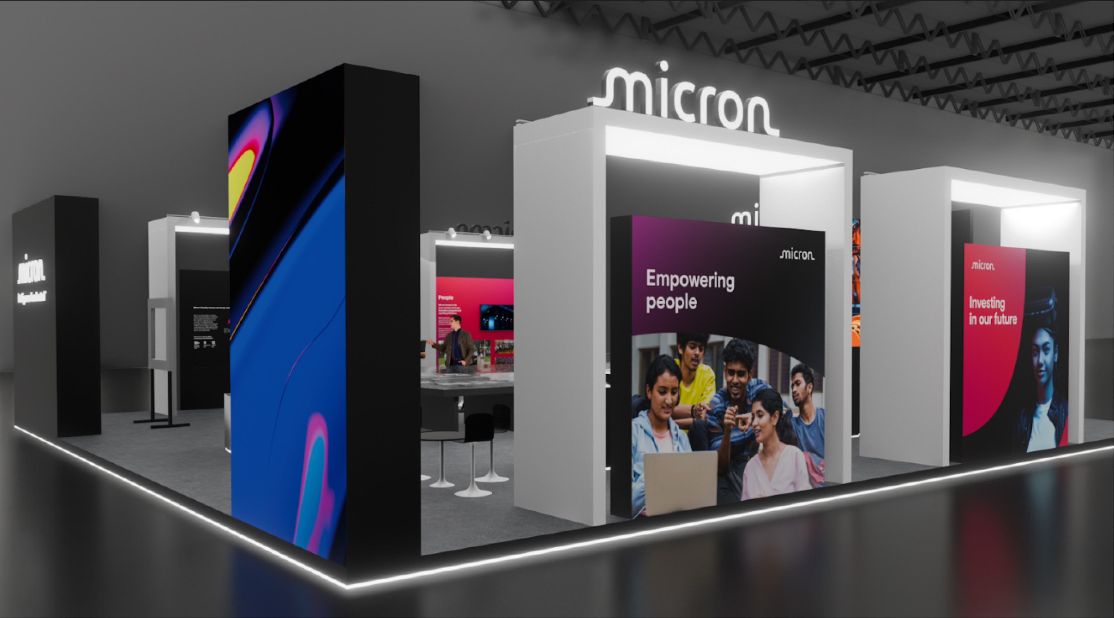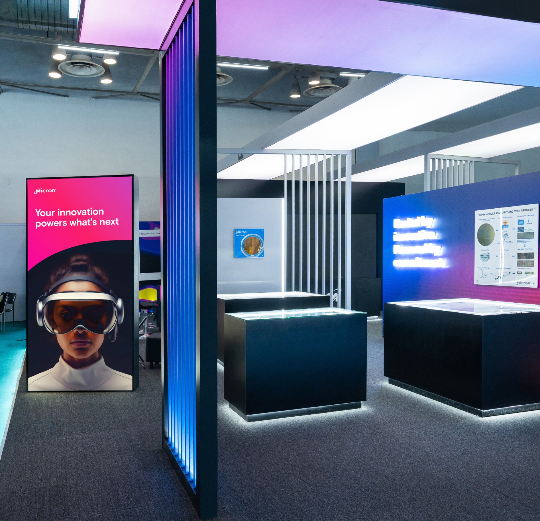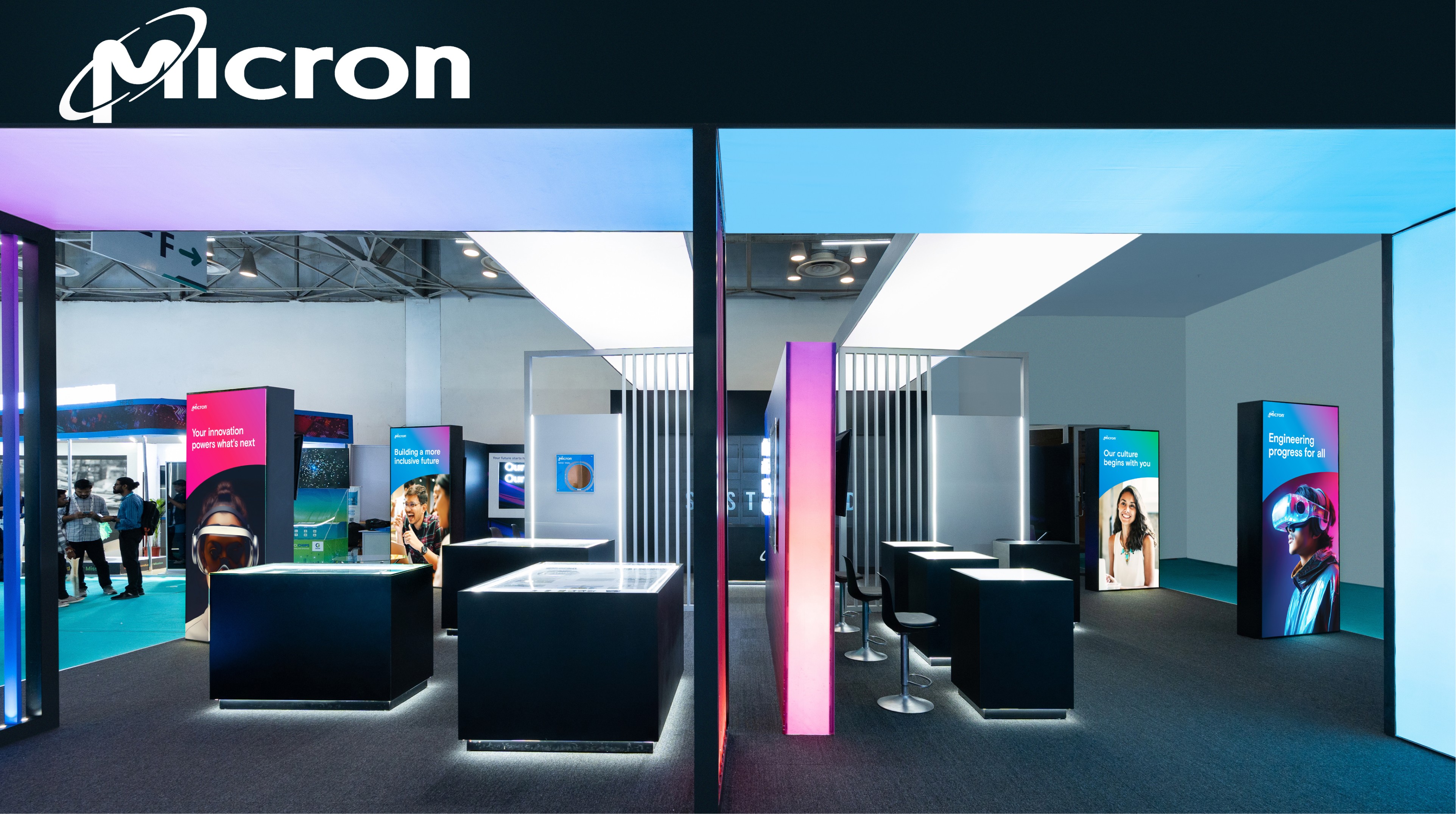 Micron, a multi-billion dollar global leader, sought innovative ideas for its pavilions at Semicon 2023, 2024, and 2025. Unlike stable office interior design, high-paced event environments require a different approach. While corporate interiors focus on creating a long-term immersive experience, high-profile events need to make an immediate impact and must be durable enough to withstand heavy foot traffic while competing with other industry giants. To navigate this challenge, we transitioned from static environmental graphics to a design language that captures the attention of government officials and competitors alike. By managing the entire process, from concept to physical build - in less than a week each year, we demonstrated that a strategic brand presence can be crafted with precision, even under tight time constraints.